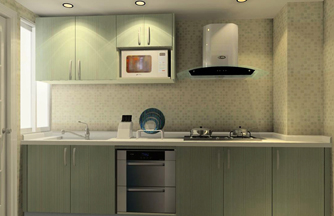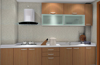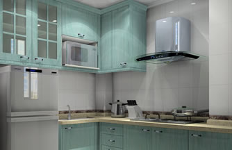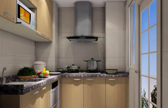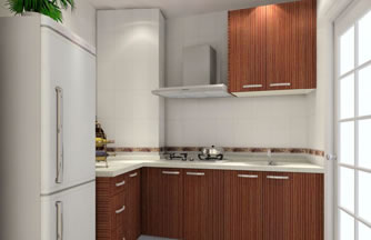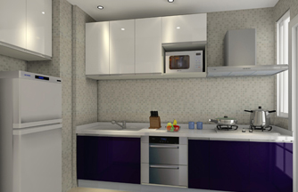 ??? 設(shè)計(jì)說(shuō)明:廚房面積較小,空間中有兩個(gè)大立柱,立柱之間的距離很狹。定制廚房利用空間化、立體化的優(yōu)點(diǎn)。包住兩個(gè)柱子在廚柜中,兩個(gè)柱子之間很狹的空間用來(lái)吊放油煙機(jī)。