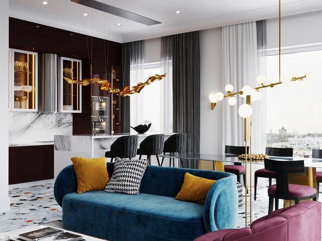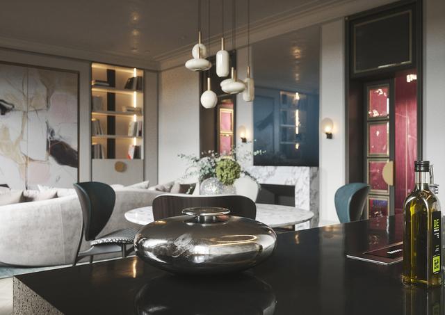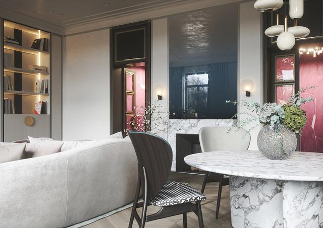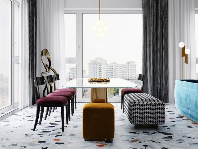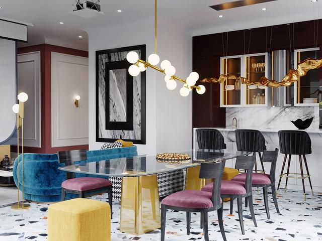 大膽的色彩搭配光滑的材料,大理石,黃金,黃銅,加上裝飾的個人元素,使這個室內(nèi)特別獨特。