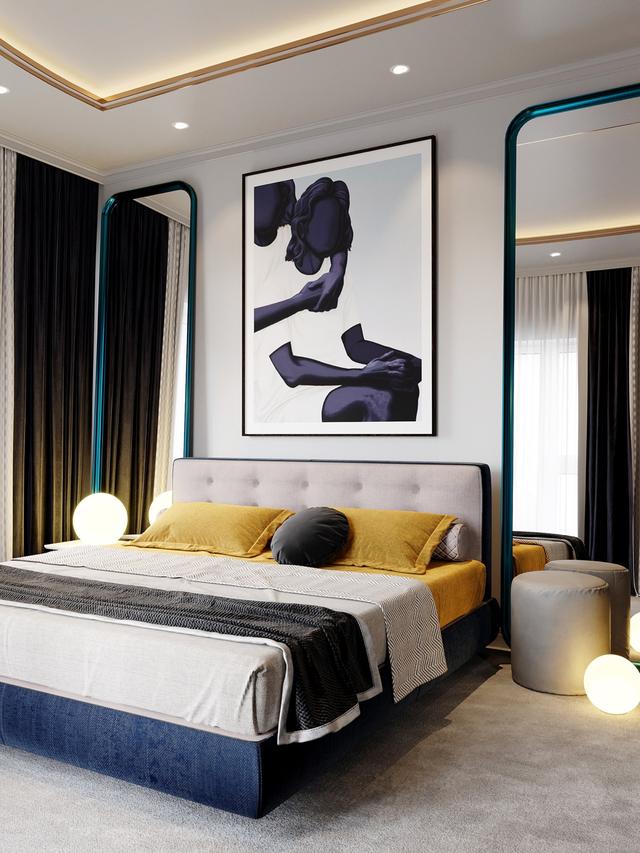 一幅現(xiàn)代藝術(shù)畫與藍色面料的床相呼應。