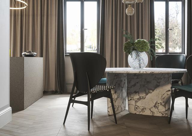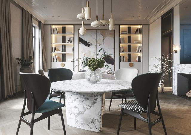 藍色和單色的現(xiàn)代餐椅環(huán)繞著圓形的大理石餐桌。