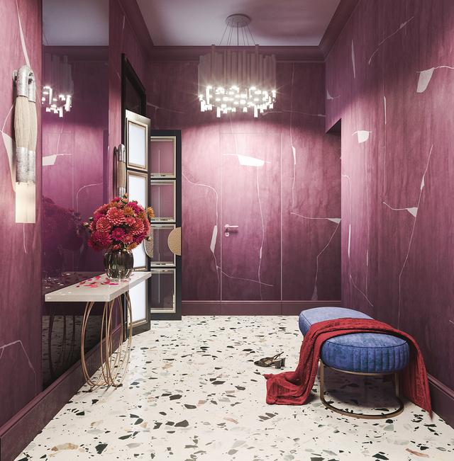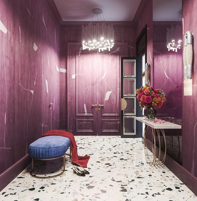 門廳要大膽得多,墻壁是深紫色的,地板是五彩紙屑圖案的。一盞現(xiàn)代枝形吊燈在頭頂閃爍。
