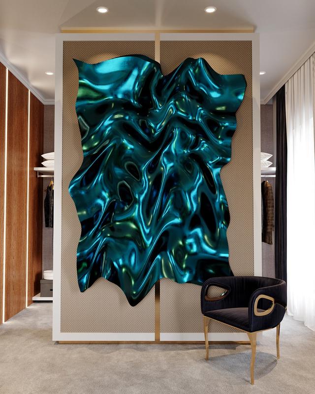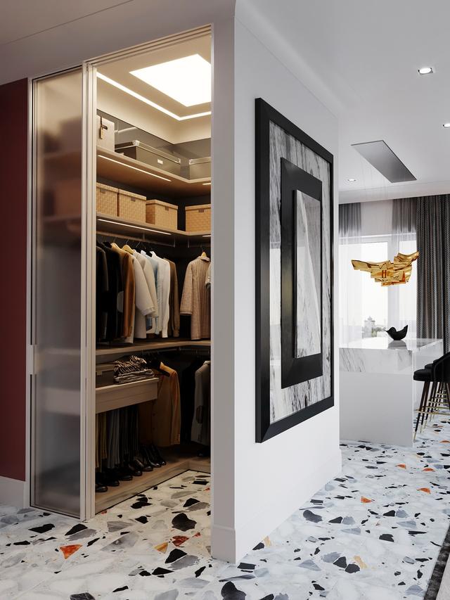 在藝術(shù)墻后面有第二個步入式衣柜。一個全面的衣櫥系統(tǒng)保持服裝整潔和容易接近。