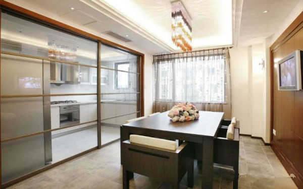 最后這一款石膏板吊頂效果圖給人一種溫馨浪漫的既視感,流蘇的燈飾不論是在造型上,還是在顏色上,都給餐廳帶來一絲浪漫的氣息。同時也為略顯沉重的家具減少了笨重感。