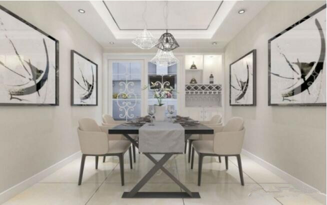 在設計上,采用凹凸的造型,擴大了餐廳的空間。再運用黑色的線條勾勒出吊頂的形狀,與黑色矩形的餐桌遙相呼應。最后搭配上黑白圓錐形的燈飾,增加了整個吊頂的設計感。在顏色上,整個吊頂用黑色點綴白色,不僅和餐廳的整體顏色統一,而且兩種顏色互補,營造了良好的視覺感受。