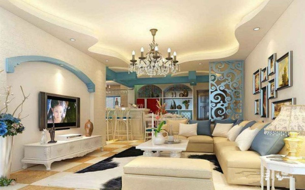 這一款效果圖整體偏向地中海風格,在吊頂上,采用波浪型的設計,使得整個房屋吊頂的輪廓線比較自然、隨意。同時也和電視的背景墻相呼應,增添了一抹浪漫的情懷。