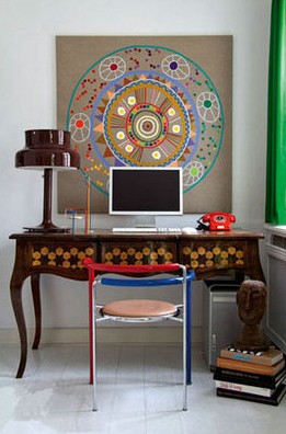 ??? 濃濃復古味的臺燈、電話和翻新的書桌,幾何圖形變換組合而成的精美插畫,讓空間充滿了特色。這樣的空間搭配上白色地板讓整體效果更和諧寧靜。