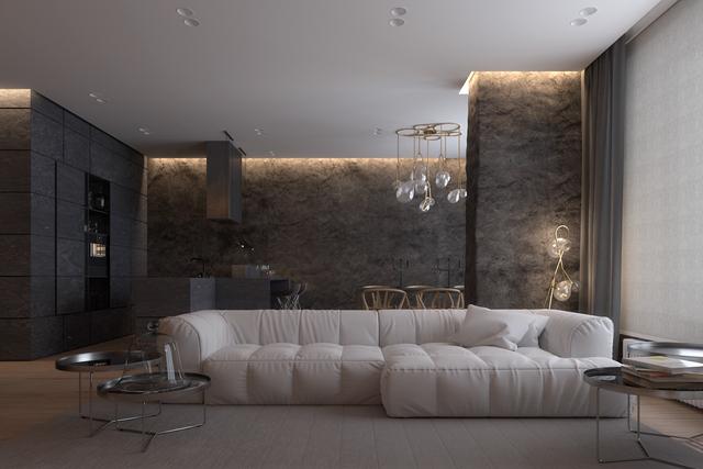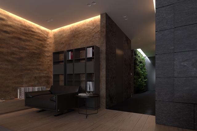 創建所有包括深紋理墻最終戲劇性的效果,就像在我們最后的家。在這里,周邊的燈光突出了深炭的褶皺墻壁。時髦的落地燈照亮了舒適的沙發旁邊一個陰暗的角落。