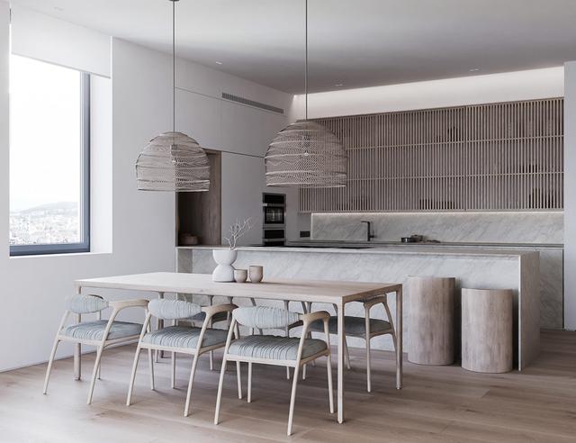 知道什么時候使用紋理,什么時候控制它。廚房的盡頭是木質和大理石相間的廚房,一面白色的墻面用白色的門偽裝起來。通過壓制一些元素,你能夠使另一個元素更引人注目,比如這個木制的展示柜。