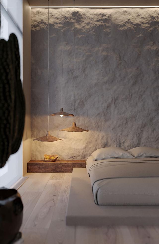 用原始的手工物品裝飾紋理區域,使其更具個性。獨特的"傘"式臥室吊燈三重奏,為臥室提供氣氛照明。在石質床頭墻的映襯下,自然流露出鄉村氣息。