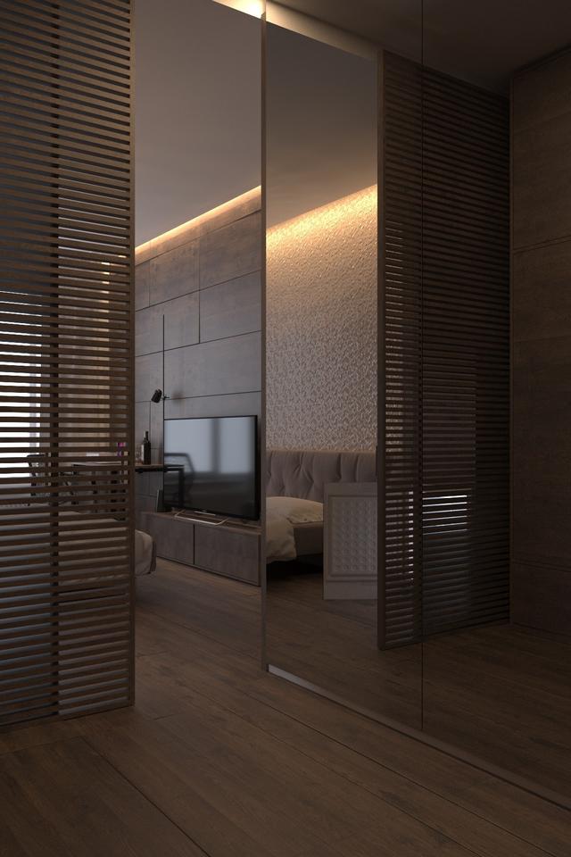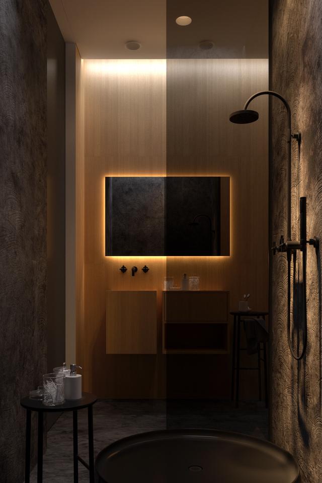 鏡子的背光效果很好,把浴室的墻壁遮擋后,似乎像通往另一個空間的大門。