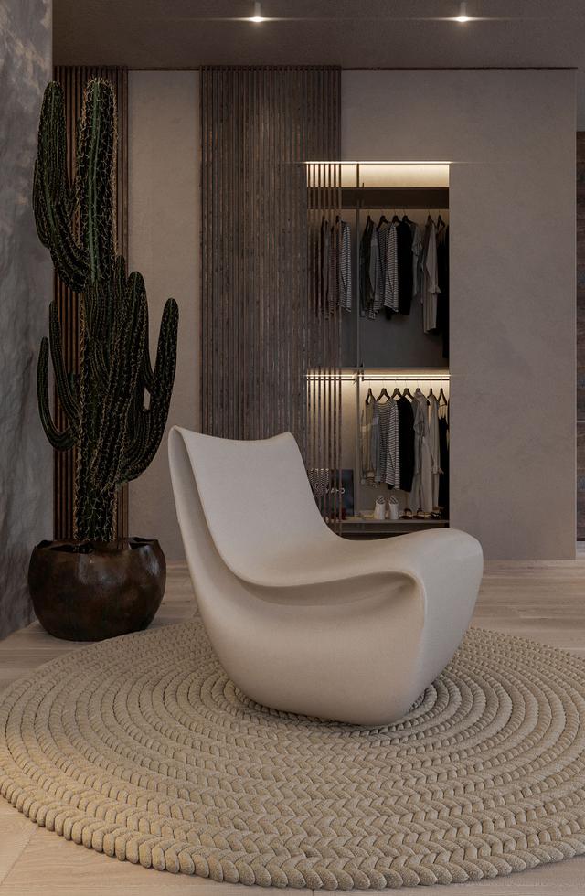 我們的第二個住宅案例位于烏克蘭基輔,總面積為50平方米。在這里,所有的墻都是完全不完美的,因為它們都是用有觸感的粘土建成的。設計師解釋說:"我們認為不完美的事物就是美。"這套公寓展現了自然的不規則和平靜,以及對自然材料和形狀的熱愛。