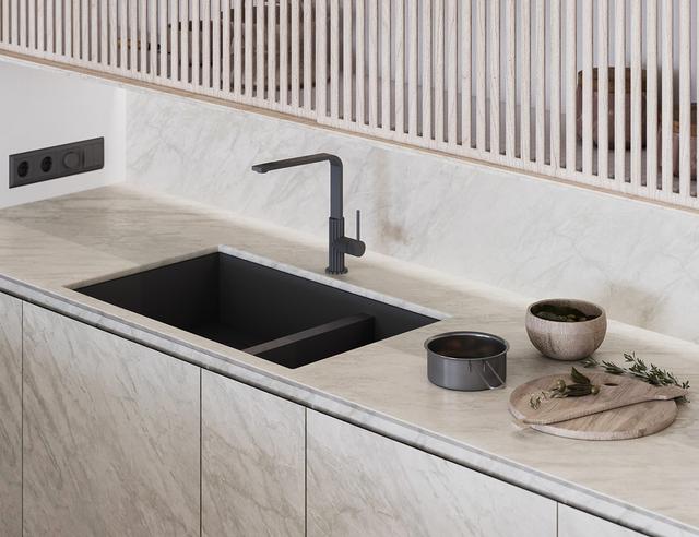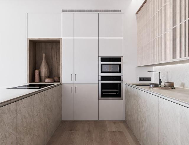 其他基礎單元,廚房臺面和后擋板也是大理石效果。沿基線方向形成的一條對角線,抵消了板條壁柜的剛性垂直特性。