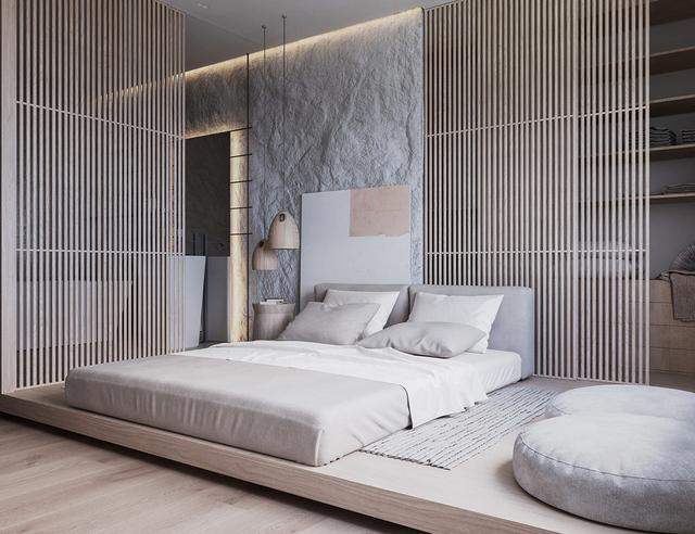 同樣的紋理可以轉換到家里的任何房間。看看主起居空間的石頭和木頭板條百葉窗如何應用于臥室。