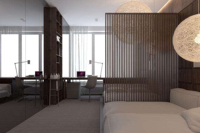 這套房間里的網狀臥室吊燈是Moooi設計的隨機燈光。