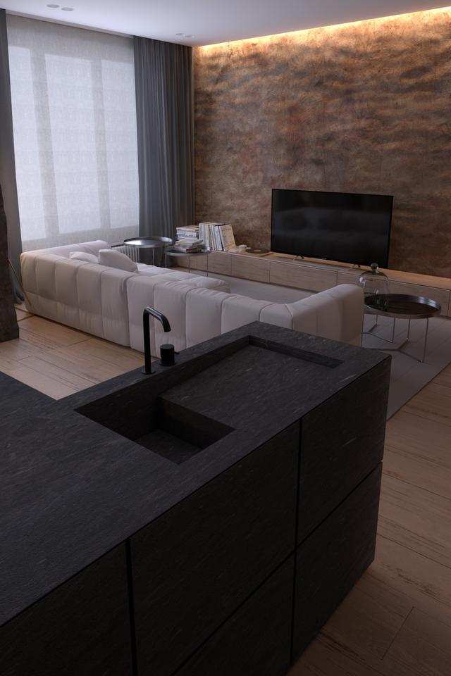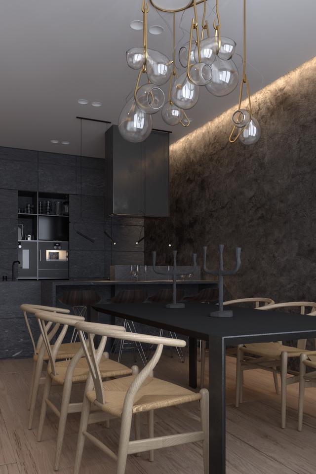 黑色和灰色的廚房幾乎消失在黑暗的背景中。正是紋理的變化定義了它。