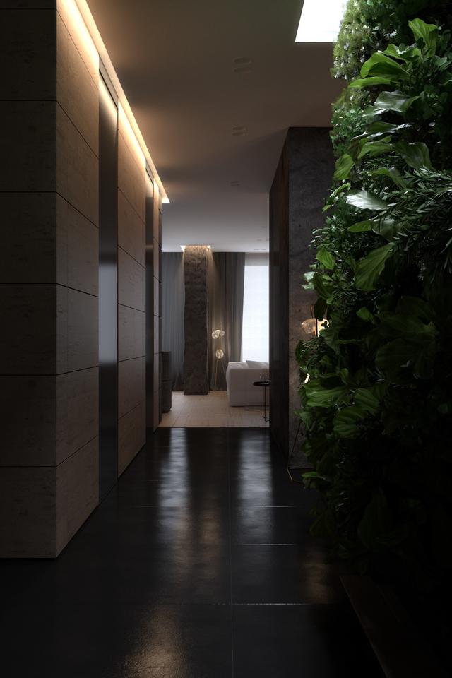 一盞落地燈將聚光燈投射在一小塊區域上,而天窗則投射出大量的光線,非常適合培育一個枝葉繁茂的垂直花園。