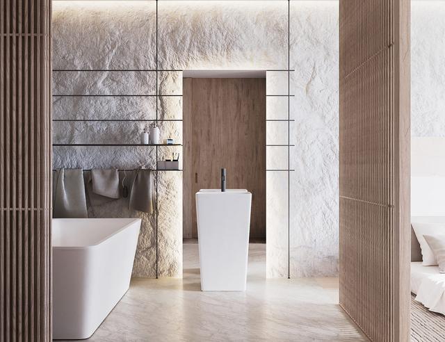 粘土效果浴室件提供了一個清新的變化,從基本的丙烯酸。瓦片狀的云狀陰影漂浮在浴缸上方。