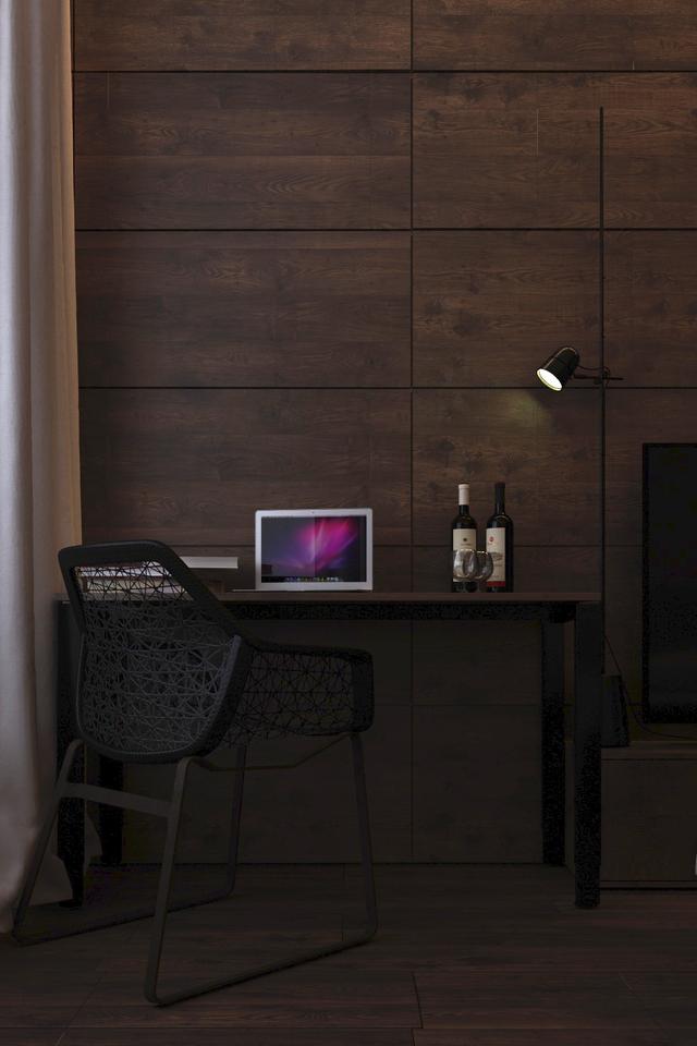 木質面板平滑地支撐著工作空間。一個現代的墻壁主要是襯托著圓滑的辦公桌與酒杯,和一個網格坐椅。