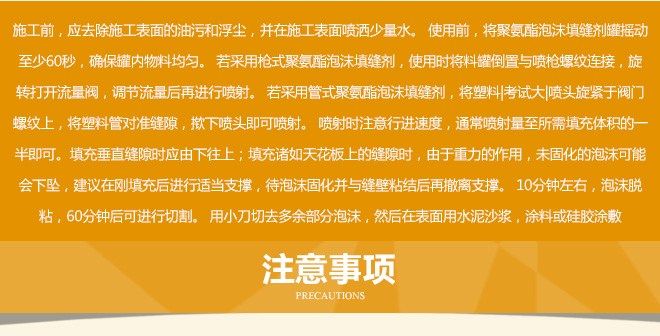當物料從氣霧罐中噴出時,沫狀的聚氨酯物料會迅速膨脹并與空氣或接觸到的基體中的水分發(fā)生固化反應形成泡沫。固化后的發(fā)泡泡沫具有填縫、粘結、密封、隔熱、吸音等多種效果,是一種環(huán)保節(jié)能、使用方便的建筑材料,可適用于密封堵漏、填空補縫、固定粘結,保溫隔音,尤其適用于塑鋼或鋁合金門窗和墻體間的密封堵漏及防水。