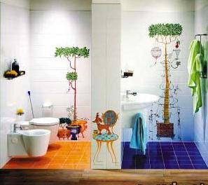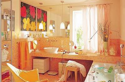 ??? 設有淋浴房的衛浴間,可以選取自己喜歡的顏色,多挑幾種色調的彩磚在淋浴房內縱向鋪貼一道色彩絢麗的墻面,再選一款顏色的彩磚給這面墻加個邊框,便能讓絢麗的墻面變身成為一幅裝飾畫。