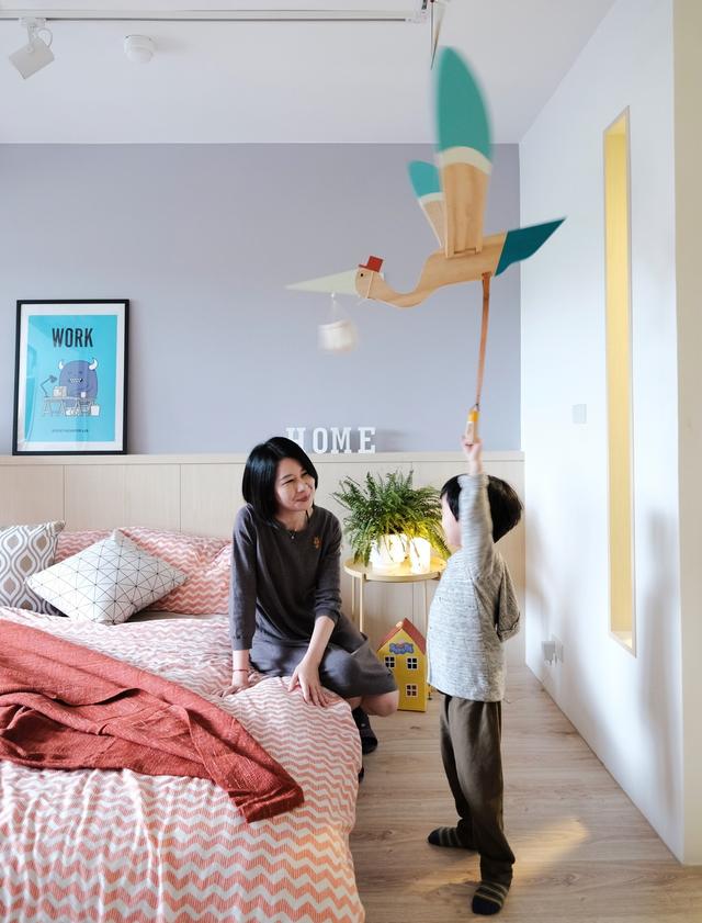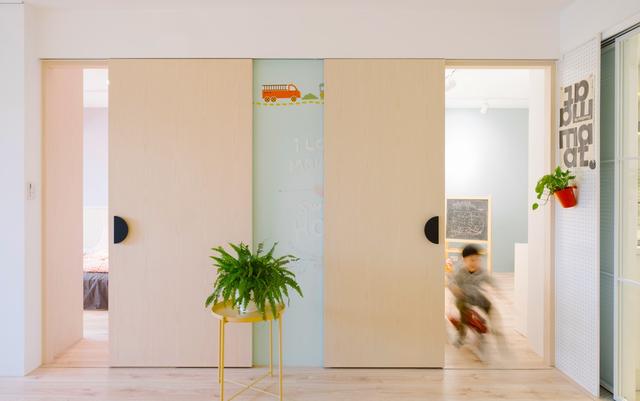 超耐磨木地板被引進來處理繁忙的家庭生活。折疊餐桌意味著在需要的時候可以騰出更多的空間來玩耍。客廳里薄荷色的黑板墻鼓勵孩子展示自己的創(chuàng)造力。