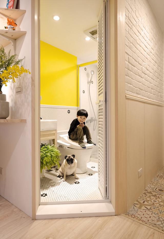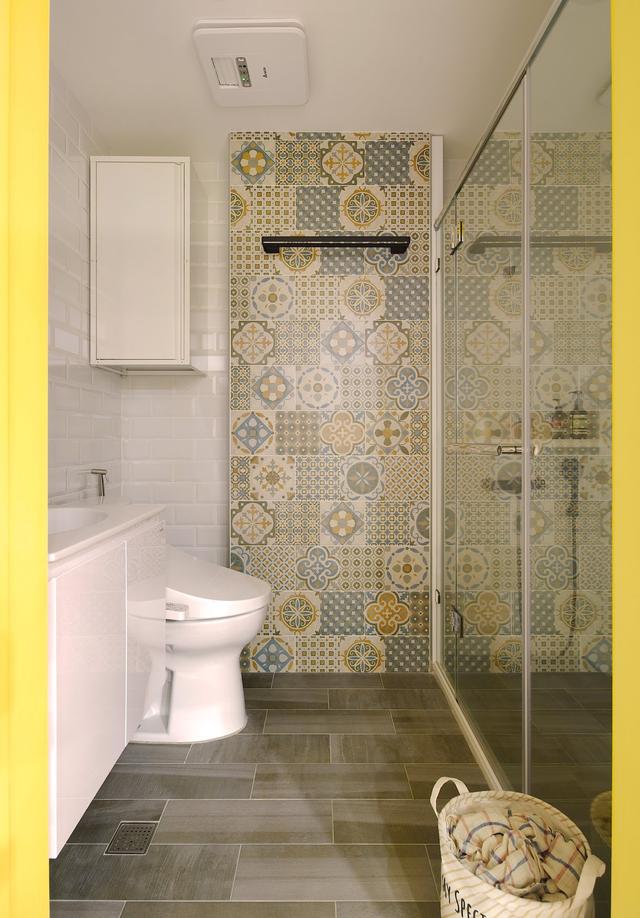 一面黃色的強調(diào)墻照亮了小浴室空間。有圖案的地磚標(biāo)志著家的入口。