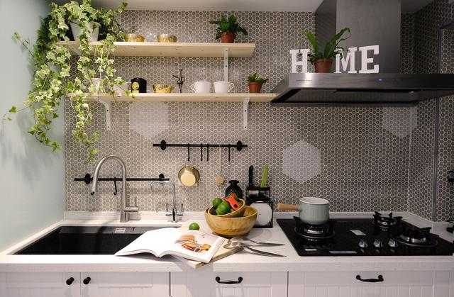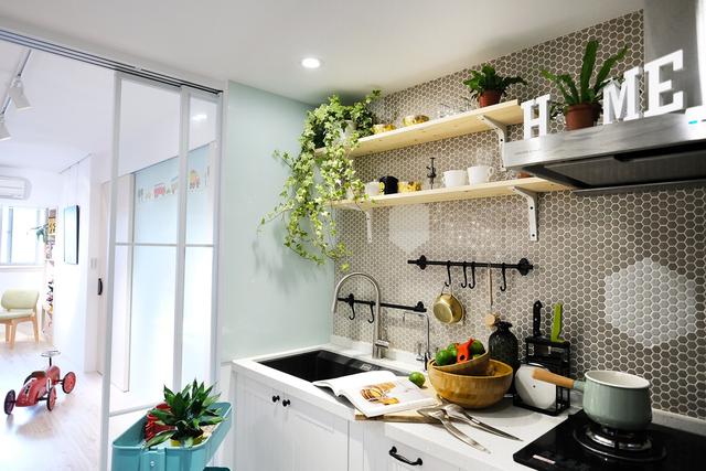 小小的灰色瓷磚覆蓋著廚房的后擋板。大量的幼苗帶來了一些綠色。