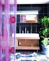 ??? 冷調的粉紫是調情的高手,手工刺繡的雛菊圖案在紫紗上若隱若現,給沉悶的衛浴帶來遐想,沉醉在這明艷的色調中,享受全身心的放松吧!來點綠植,大片的綠葉豐富了黑色瓷磚的層次,給浴室帶來了無限的生機。