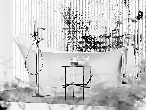 在浴缸與其他房間的隔斷中,她特地采用了金屬管,這是現(xiàn)代裝飾中較常見的隔斷裝飾手段,但通過透明簾子和綠色植物的襯托,讓本來硬朗的金屬隔斷變得朦朧而柔美。
