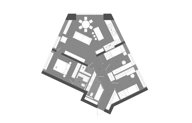 這個住宅平面圖更好地展示了公寓富有挑戰性的足跡。在這里我們可以看到六角形的客廳,客廳,廚房和餐廳區域。這種奇怪的戶型,一般設計師都是Hold不住的。然而在以上這樣的設計出爐后,你覺得如何呢?