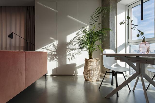 室內植物給城市公寓帶來了生機。一個大的試件軟化了原始混凝土柱的外觀;藤條花盆為整個設計增添了額外的溫暖和質感。一束綠色植物從餐廳餐桌中央伸出。