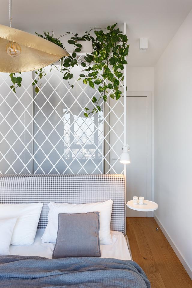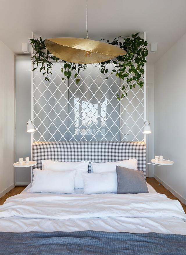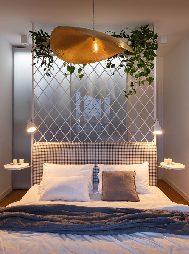 金色的臥室吊墜在藍白相間的床上閃閃發光。蔓生植物在臥室的隔板上茂盛生長。