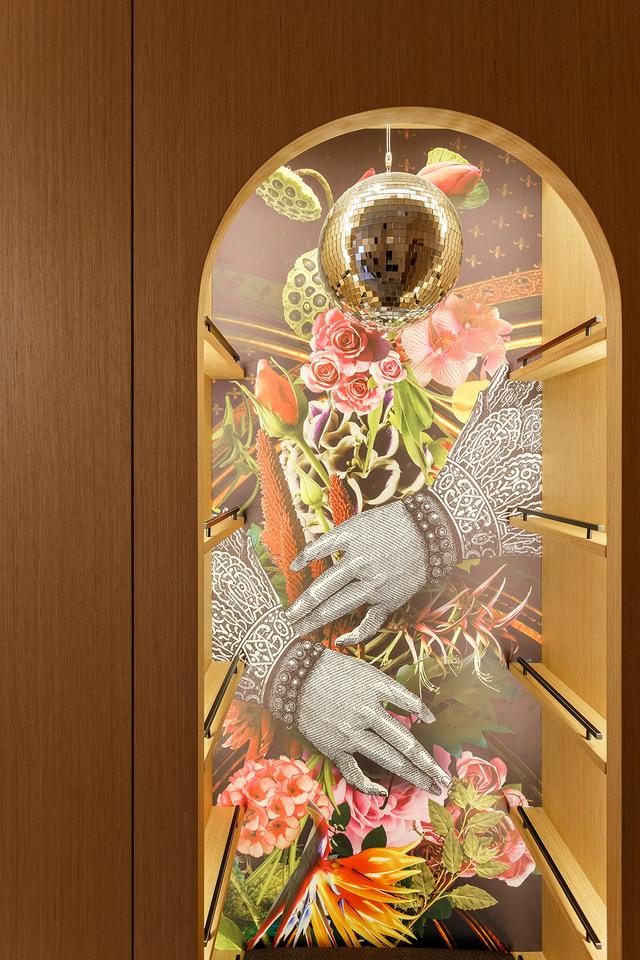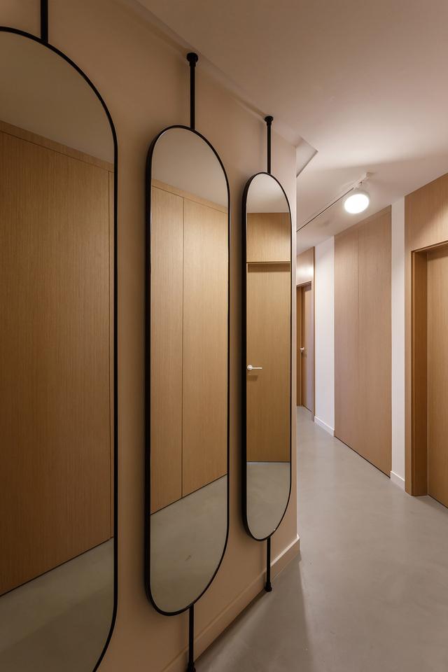 橢圓形的鏡子有助于在沒有窗戶的走廊里創造一種光線和空間的感覺。