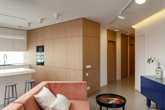 木質效果的櫥柜被放置在白色廚房的一側,以溫暖整個廚房。走廊的內門和周圍都是用匹配的材料完成的,這創造了沿著大廳長度的間隔良好的"條紋"視覺。