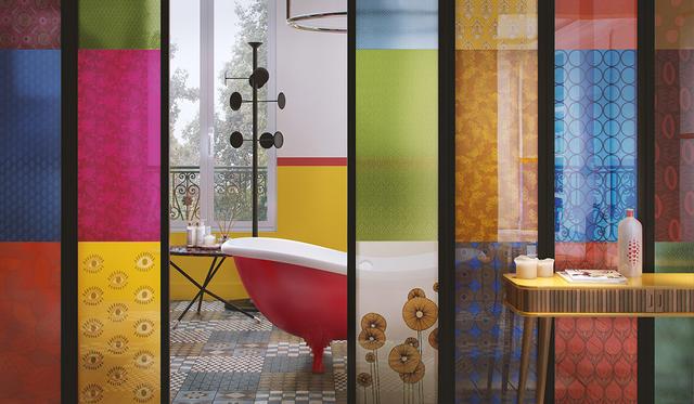 滑動玻璃門通向浴室。玻璃背面有一層彩色薄膜,每一層都有自己獨特的圖案。從浴室窗戶透出的光線使這個令人驚嘆的設計看起來很明亮。在浴室內,一個紅色的卷頂浴缸放佛在等待著什么,它的爪子抓著各種圖案的瓷磚地面。墻上,紅色的條杠包圍了房間,鮮艷的陽光黃色填充了下半面墻。一個獨特的衣架放置在窗前,旁邊的矮桌可以放置一些洗澡用品。