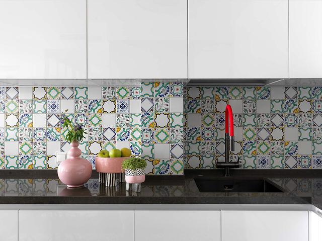 黃色,藍色和藍綠色的圖案瓷磚點綴著新鮮的白色瓷磚,創造了一個色彩豐富但干凈的廚房反濺。這一次,粉紅色的裝飾以淺粉色花瓶的形式出現,再加上一個草本植物花盆和配套的水果盤,讓空間多了幾分活潑的生機。