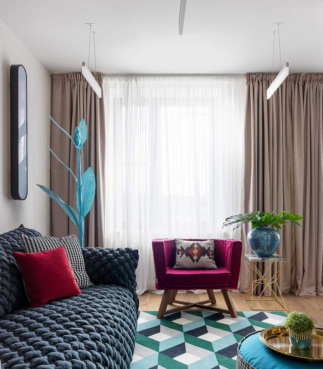 一個小的邊桌有金色的腿,與咖啡桌上的托盤相匹配。紫紅色的椅子與旁邊的藍綠色沙發形成了完美的對比。座位上點綴著部落圖案的散墊。