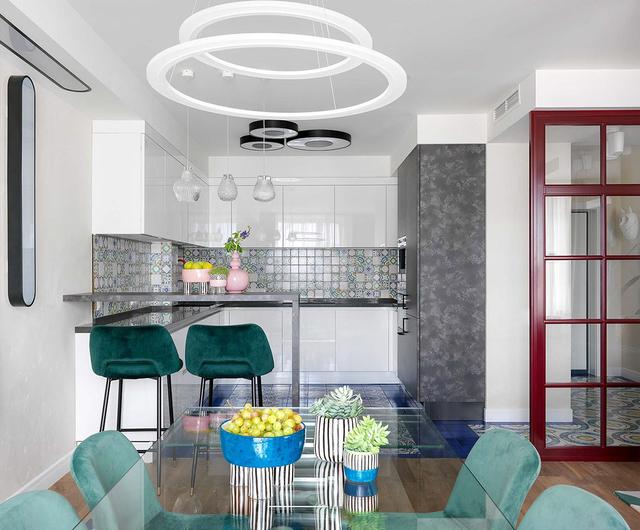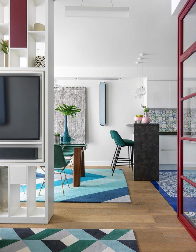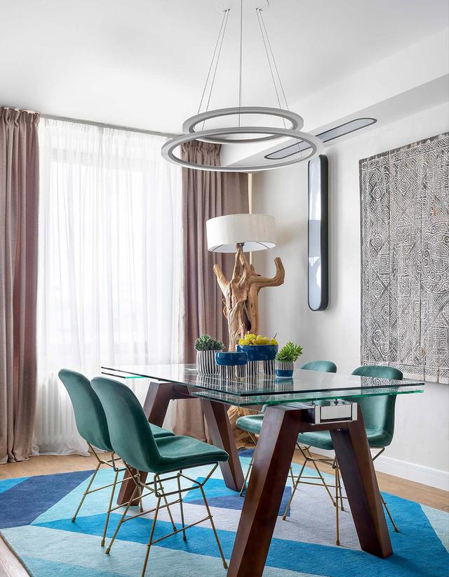 餐廳與帶有早餐吧臺的廚房相連。藍綠色的陰影貫穿始終,并在餐廳桌子下的一個大的幾何風格的地毯。