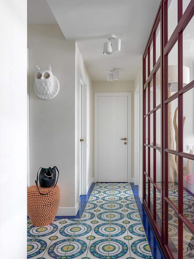 廚房里的地板是采用的藍色圓形設計,在地板中間,它變成了藍色和黃色交錯的圓形圖案。