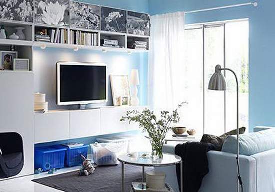 整個空間采用了淺藍色作為墻面的裝飾,讓人有神清氣爽的感覺,在搭配上白色的家具以及白色額的地磚。電視柜和收納柜一體化設計,讓它成為了這個小客廳的一道風景線。座位旁邊的落地燈和小茶幾上的綠植都是客廳最好的點綴。