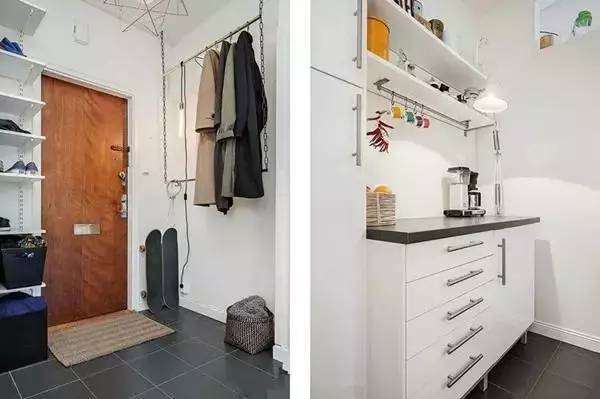 玄關的簡易衣架,看似簡單,但是充滿設計感,衣架上還接有一個小型燈柱,既實用,還增添了一些時尚性。