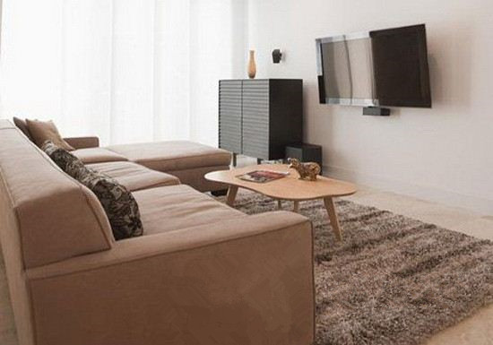 圖中客廳的空間是比較小的,但是卻給我們一種很寬敞的視覺效果,適合的裝修適合的家具可以讓整體效果最佳呈現。L型軟裝沙發搭配上圓滑的木質小茶幾,這個沙發區寬敞又舒適。掛墻的液晶電視也為地面減輕了負擔,旁邊的木質收納柜可以放些常用的客廳用品。這樣,一個簡潔明快又素雅的客廳就形成了。不過,這樣的設計不太適合雜物太多的家庭。