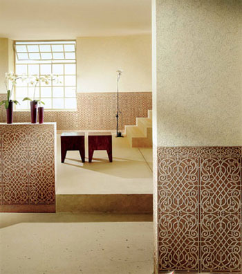 墻面下半部:下半部分的墻基布采用對稱的剪影葉脈圖案。無論采用布粘膠,還是采用墻面粘膠,都要注意第一幅必須垂直或水平。由于墻基布表面紋理凹凸感強,不光滑,并且凹中有凸,凸中有凹,能有效阻礙聲波反射,有一定的吸音功能。