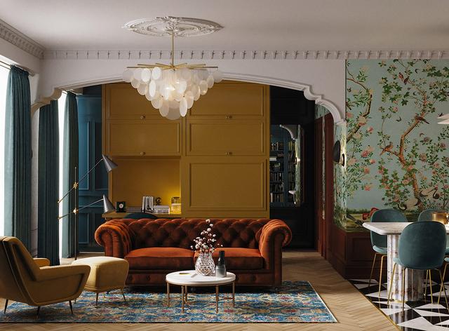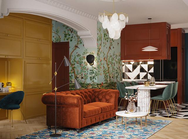 第三個家居空間中,采用了稍微深沉一點的色調。黃色柜子、棕色沙發、還有那花卉墻壁,頗具維多利亞式的氣氛。