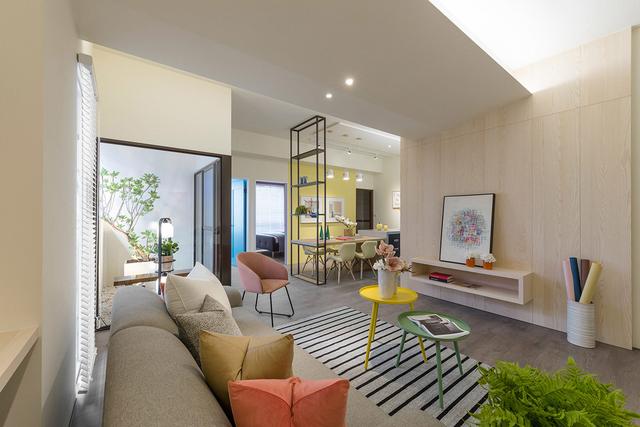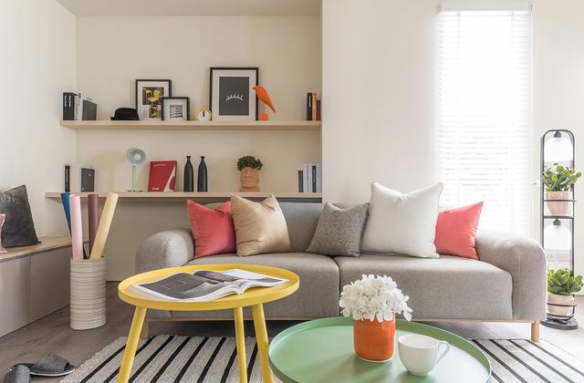 在第二個房間中,一些嵌套在咖啡桌上的顏色對比讓整體有了一個充滿陽光的開始。