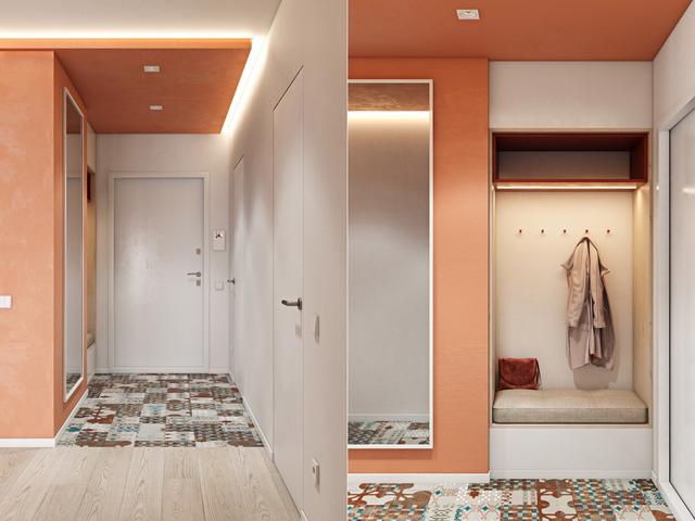 橙色墻面天衣無縫地連接走廊,走廊里有一個小長椅嵌入了一個凹處。一排墻上的掛鉤使掛在它上面的外套有一個地方。地板上大膽的圖案,加上白色與橙色的墻面,使這部分空間看起來很有個性。