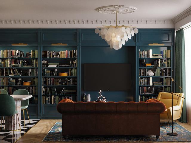 一盞半透明的白色枝形吊燈懸掛在暗綠色的房間里,與深色電視墻形成對比。電視墻旁邊是書柜。整個空間風格顯得深邃而平靜。你可以倚在黃色沙發上,借著窗外的陽光看上一整天的書。想想都感到愜意呢~