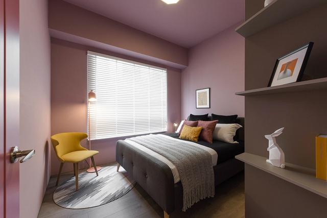 除了藍色主題的書房,這個公寓還有一間粉色主題的臥室。這間粉紅色的臥室甚至有一扇粉紅色的門和一個粉紅色的天花板。墻角一把黃色的椅子打破了打破了粉色的主題。黃色的臥室椅子,床墊和架子小擺設。一盞粉紅色的落地燈與墻壁融為一體。床頭墻壁上的黃色調藝術畫與床上的黃色枕頭、墻角的黃色椅子呼應。與整個空間的粉色調碰撞卻又非常和諧。雙人床占據了臥室狹窄樓層的大部分空間,開放式的壁櫥和儲物架保持了物品的整潔和方便。整個臥室空間看上去明亮溫馨。