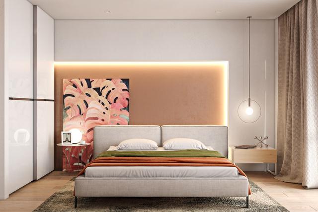 橙色和粉色的熱帶樹葉版畫是臥室藝術的主題,它們占據了半面墻的橙色基調。一盞精致的臥室吊燈落在它旁邊的白色空間里,形成了和諧的對比。綠色和橙色的床罩用對比鮮明的條紋裝飾。白色的電視墻面板矗立在床腳對面的另一個橙色的墻壁上。衣柜門與臥室門相互承托,讓空間更加協調。整個臥室空間采用極簡現代的風格,在時尚的元素上營造出一絲溫馨。