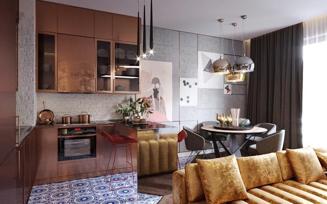 時髦的沙發鋪著金色的軟墊,旁邊是一個精致的銅制主題的廚房。在銅制的廚房里,餐廳的吊燈將一簇金屬色調結合在一起。墻壁與廚房利用不同主題進行分區,卻利用金屬的吊燈,將餐廳與廚房相互融合卻又互不打擾。這樣的設計手法在我們現代家居設計中非常適用。